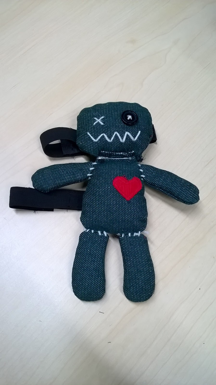 Kaikki palaset olivat kasassa joten etsin täytteeksi tiloissa pyörinyttä raakavillaa. Ompelu, kääntäminen ja täyttäminen kutistivat työtä melko paljon, mitä olin toivonut, sillä otin paloista hyvin suuret. Muoto tosin kärsi hieman samalla, mutta ei onneksi liikaa ja voodoonukke saakin olla hieman rähjääntyneen näköinen.